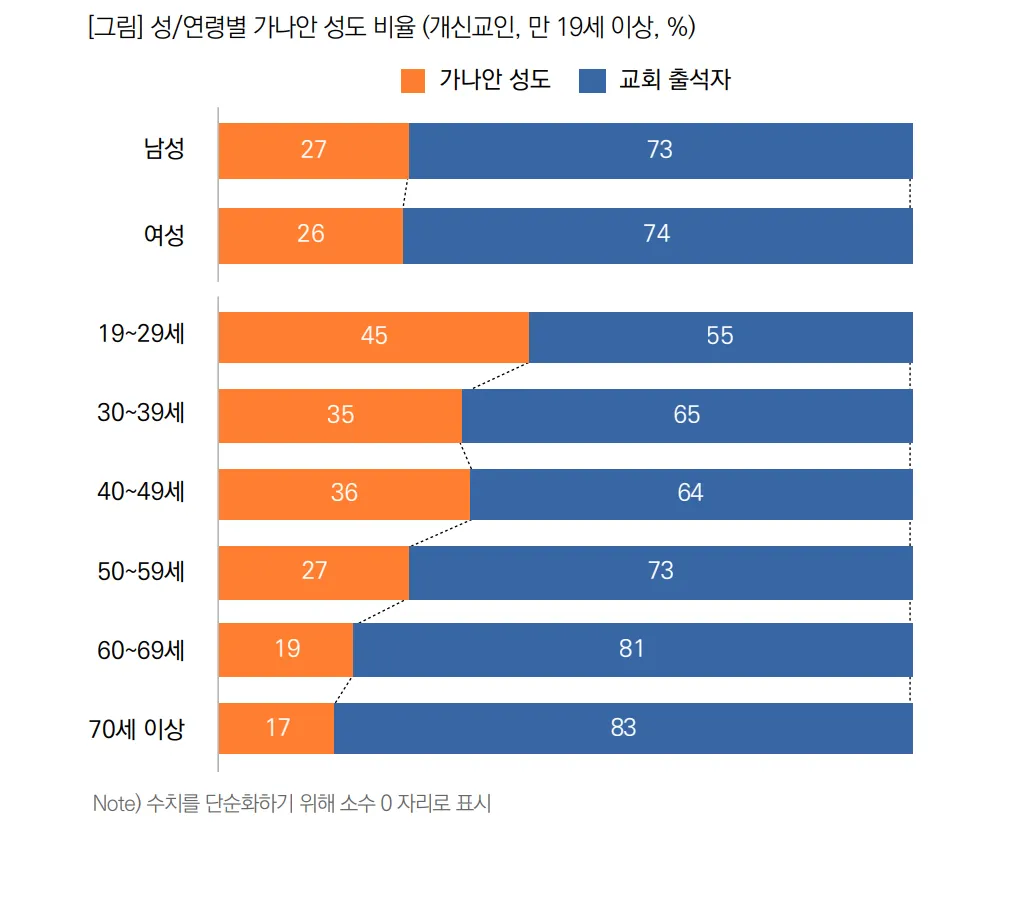 헌신적/참여적 신자 | 25만 | 30만 | 75만 | 175만 | 210만 | 50만 | 565만 |